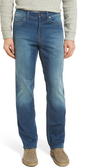 A soft, rich blue wash styles classic jeans cut from sleek stretch denim with straight legs and clean back pockets.