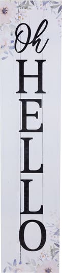 Add a touch of charm to your home with this wooden porch board leaner. Crafted from white wood planks, this delightful piece features the welcoming phrase "Oh Hello" adorned with delicate floral accents. Perfect for any room in your home or can be displayed on your covered porch or patio This stylish wood sign is sure to make a warm and inviting statement. Product Features: Wooden decorative hello porch board leaner Crafted with the look of white planks Sign reads "Oh Hello" Accented with floral designs Comes ready to hang with 2 D-ring hangers or can be leaned against a wall Covered outdoor area or indoor use recommended Dimensions: 36"H x 8"W x .25"D Material(s): wood/metal
