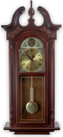 Bedford Clock Collection offers you the elegance and beauty of classic style with the modern reliable technology of today's wall clocks. Whether a gift to your self or for someone else, this clock will add a special touch of sophistication to any room. With its stunning Cherry Oak finish, Golden Accents and Swinging Pendulum, this wall mountable time piece is not only an attractive focal point, but a functional and reliable piece of technology. With 4 distinct Chimes, the clock will announce the beginning of each new hour for your convenience. Carved details and special touches through out , as well as a convenient Sleep Mode that provides you with the option to pause the melodic chimes of this beautiful time piece for an entire 12 hour period with a simple push of your finger. Item Dimensions: 5.00" x 16.75" x 38.00" Item Weight: 15.25lbs