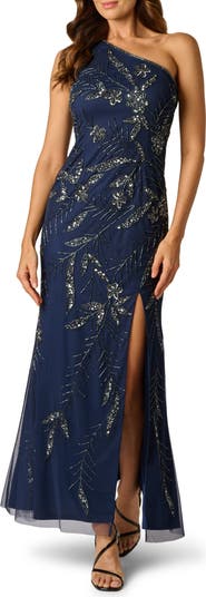 3D Beaded & Sequin One-Shoulder Gown