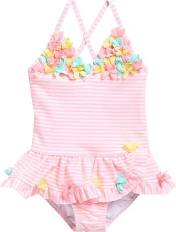 Your little one will love splashing around in this skirted one-piece swimsuit patterned in stripes and embellished with fluttery flowers in bright colors.
