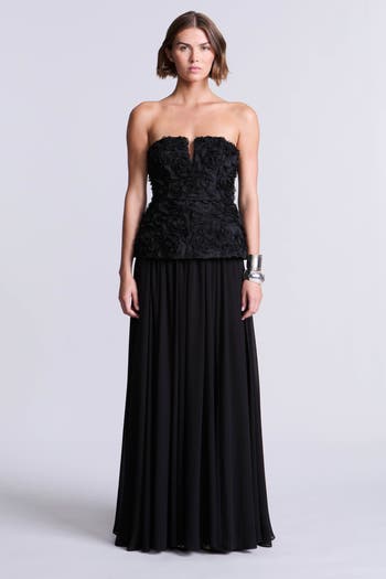 Strapless evening gown with a 3D rosette bodice and a soft, sweeping chiffon skirt. Designed with a notched neckline for structure and a fitted waist that flows into full, floor-length pleats. A romantic pick for black-tie weddings, holiday galas, or any night that calls for drama.