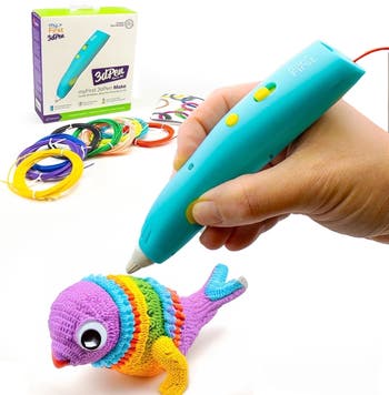 Easy to Use 3D Pen for Kids - 3dPen Make Starter Kit. \nKit includes 9 different color filaments (3m each) stickers and a booklet of templates to get you started.\nSafe to Touch Tip - Special PCL Filament has lower melting point so tip does not get hot, and extruded filament does not burn the skin.\nRechargeable battery makes use super easy with no wires getting in the way of your creativity!