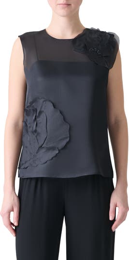 A bead-seeded appliqué poppy blooms at one shoulder balanced by a larger blossom at the opposite hip on this silk-organza sleeveless top.