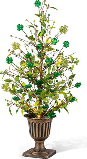 This 36"H Lighted St. Patrick's Urn Porch Tree, equipped with a timer, showcases greenery adorned with shamrocks, gold beads, and small green berries in a decorative urn. It brings a festive, illuminated charm to your porch for St. Patrick's Day.