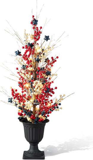 This 36"H Patriotic Americana Lighted Berry and Stars Urn Porch Tree is preferred for porch use. This classic and specific creation incorporates elements symbolizing Patriotic, illuminated by warm lights to create national day atmosphere.