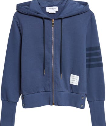 House codes collide in this shrunken Italian-cotton French terry hoodie, where varsity-style stripes and a school–inspired name tag underscore Thom Browne's typical preppy/collegiate sensibility.