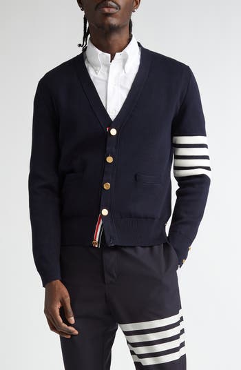 Signature four stripes and tricolor logo trim put the label's unmistakable stamp on this cardigan Milano-stitched from pure cotton.