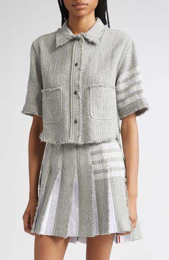 With its artful cropped silhouette, this tweed shirt-jacket epitomizes Thom Browne’s attention to detail. A tricolor grosgrain tab at the nape and signature 4-Bar stripes encircling one sleeve add bold contrast to its refined texture.