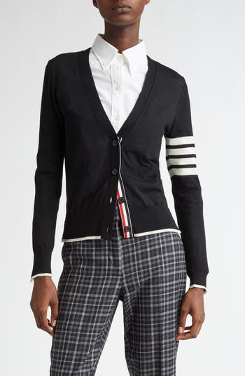 Signature four stripes and tricolor striped trim put Thom Browne's unmistakable stamp on this virgin-wool cardigan crafted in a comfortable, relaxed fit.