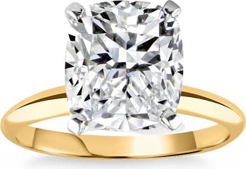 This stunning womens engagement ring features a large 4Ct cushion cut certified lab grown diamond. The diamond is four prong set in high polished mounting. Finger size 6.5 only. Can resize if needed