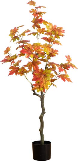 Capture the essence of autumn year-round with our artificial maple tree. This piece brings the warm, vibrant hues of fall right into your home with its stunning array of orange and red leaves. The leaves, reminiscent of a crisp autumn day, are displayed on a gracefully curving trunk, showing off nature's asymmetrical perfection. With a height of 3.5', this faux maple tree fits comfortably in a cozy corner or alongside your favorite reading chair. It's secured in a black nursery planter, allowing you to DIY in your favorite decorative pot. Add this charming tree to your space for an instant splash of fall's splendor. Great for Halloween, Thanksgiving and harvest parties.