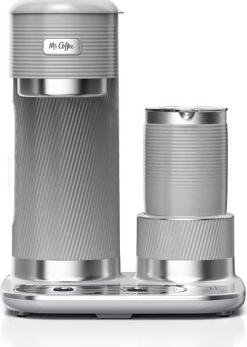 With its convenient 4-in-1 functionality-latte, cappuccino, iced, and hot coffee-the Mr. Coffee Single-Serve Latte Lux, Iced, and Hot Coffee Maker makes it easy to brew your favorite coffeehouse drinks at home. Its textured design, with chrome elements and capacitive touch panel, will elevate your kitchen. The built-in frother and preset latte and cappuccino buttons automatically adjusts frother speed to create hot or cold foam. Easy measuring system has a dual-sided scoop for consistently flavorful coffee that's never watered down, and ideal coffee-to-milk ratios for perfect latte and cappuccino froth. Brew a concentrated shot of coffee for lattes and cappuccinos, as well as 8, 12, or 16 oz. of bold, hot coffee or single servings of refreshing iced coffee. Single-serve reusable filter delivers taste without waste. Enjoy iced coffee and lattes at home, or on the go with the double-wall insulated 22-oz. reusable tumbler. Includes recipe book for lattes, cappuccinos, and more.