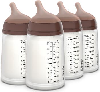 Transition seamlessly from breast to pacifier to these bottles featuring asymmetric adaptive-flow nipples and skin tone–inspired hues to reduce confusion and discomfort for baby. A medical-grade, patented silicone bag housed within the bottle collapses while baby sucks to reduce the intake of colic- and indigestion-causing air. Milk only flows when baby sucks, further mimicking natural breastfeeding.
