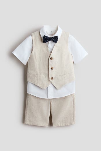 Set with a waistcoat and a pair of shorts in an airy weave, a shirt in soft poplin and a complementing accessory. Lined waistcoat with buttons and fake welt pockets at the front. Knee-length shorts with adjustable elastication at the waist, a fake fly and button, discreet pockets in the side seams and a fake welt pocket at the back. Short-sleeved shirt with a turn-down collar and buttons down the front. Accessory with an adjustable elastic strap and a plastic fastener at the back.