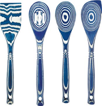 The Willshire 4-Piece Utensil Set includes a corner spoon, slotted spoon, solid spoon, and spatula, all crafted from colorful and durable pakkawood. Designed to be safe for nonstick cookware, these kitchen tools are ideal for everyday cooking and serving. The vibrant Blueberry woodgrain finish brings elegance to any kitchen.