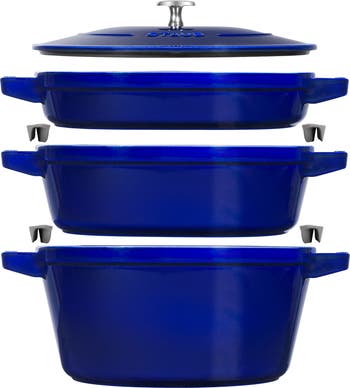 Additional features: Cook soup on the weekend in the cocotte, braise chicken thighs midweek in the braiser and grill burgers on the grill pan for a quick family meal. Attachable rubberized bumpers are included to ensure each piece remains scratch-free when stacked and unstacked. The textured black matte enamel interior requires no seasoning and ensures exceptional browning and heat retention and distribution. The smooth enamel bottom works on all stovetops, including induction. A heavyweight, tight-fitting lid retains moisture, while spikes on the lid create a rainforest effect, evenly returning juices back onto food.