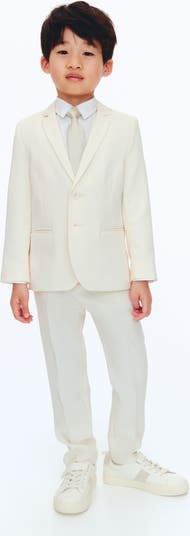 Set with a lined suit jacket and pants in soft woven fabric, a shirt in poplin, and a matching pre-tied tie. Jacket with notched lapels, buttons at front, welt front pockets, and a vent at back. Pants with an adjustable, elasticized waistband, zip fly with button, a decorative back pocket, and pleats. Shirt with a turn-down collar, buttons at front, a yoke at back, and long sleeves with button at cuffs. Pre-tied tie with an adjustable, elasticized strap and a plastic fastener at back.