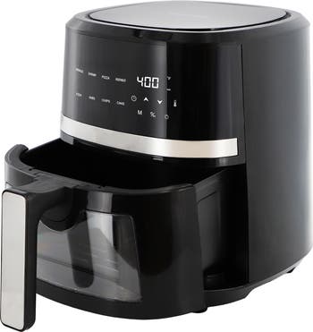 Crispy Results with Less Oil - MegaChef 4 Quart Digital Electric Air Fryer with LED DisplayEnjoy healthier meals without sacrificing flavor with the MegaChef 4 Quart Digital Electric Air Fryer. Featuring a powerful 1350W heating system and adjustable temperature settings from 160°F to 400°F, this versatile appliance uses rapid air circulation to cook your favorite foods to crispy perfection-with little to no oil. The sleek Black and Stainless Steel design includes an easy-to-use digital control panel with LED text display, a 60-minute timer, and a transparent viewing window for monitoring your meals.Perfect for families or small gatherings, the 4-quart capacity offers plenty of space for fries, chicken, vegetables, and more. Safety and convenience are built-in with features like a cool-touch handle, anti-slip feet, automatic shut-off with ready alert, and a safety switch that powers off when the pan is removed. Clean-up is a breeze thanks to dishwasher-safe parts and the included 125-piece set of square paper liners for mess-free cooking.