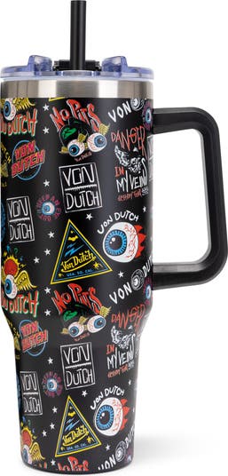 The Von Dutch 40oz stainless steel tumbler combines iconic design with performance. Featuring an ergonomic handle, no-sweat exterior, and 3-in-1 lid, it keeps drinks cold for 24 hours or hot for 10. Durable, bold, and cupholder-friendly, it’s hydration with a rebellious twist.
