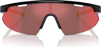 A wrapped shield silhouette enhances the fit of racer-inspired sunglasses featuring the iconic Ferrari logo and rubber-tipped temples.