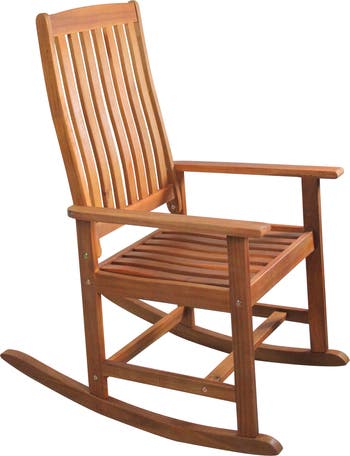 Summertime is about enjoying the sunshine with family and friends. This rocking chair will be the perfect addition to your summertime decor and to use year-round. The rocking chair is ideal for rocking on the porch at night with your other half, children, or grandchildren. Product Features: Brown wooden outdoor rocking chair Comfortable curved seat and back Long lasting wood with water-based and waterproof coating finish There is an easy 8-piece assembly - seat and back are assembled, you simply have to attach the arms and legs Contains brass colored hardware and joints There are instructions included for an easy assembly Weatherproof for indoor or outdoor use Dimensions: Overall: 43" high x 24.5" wide Back: 28" high x 19.75" wide Seat: 20" wide x 18.5" deep Material(s): acacia wood/metal