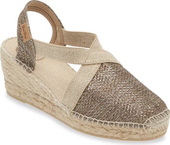 A shimmery metallic upper contrasts with the rustic espadrille wedge of a breezy sandal that's an eye-catching update for your casual style.