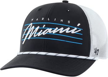 Show off your Miami Marlins pride with this '47 Downburst Trucker Adjustable Hat. This stylish hat features the Miami Marlins name embroidered in raised detail across music scale lines on the front, adding a unique and eye-catching element to your game day look. With two solid front panels and four mesh mid and rear panels, this hat provides optimal breathability and comfort.