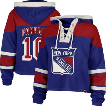 Bring a touch of Madison Square Garden style to your everyday look with this New York Rangers Superior Lacer Cropped Pullover Hoodie from '47. Featuring embroidered applique player and team graphics, this hoodie stylishly showcases your Rangers spirit. The midweight design and fleece lining provide optimal comfort for moderate temperatures, making it a great layering piece for chilly game days or casual outings.