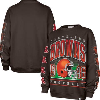 Stay cozy while showing off your team pride in this Cleveland Browns Go Big Oversized Pullover Sweatshirt from '47. The oversized fit provides a comfortable and relaxed feel, perfect for layering or lounging. The screen print team graphics with glitter details add a touch of sparkle and team pride, making this sweatshirt a standout piece in your Cleveland Browns collection.