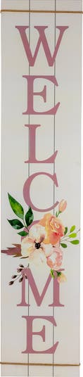 Add a touch of charm to your home with this wooden porch board leaner. Crafted from white wood planks, this delightful piece features the "Welcome" a delicate floral accent as the "O". Hang in any room in your home or lean against a wall on or porch or patio. This stylish wood sign is sure to make a warm and inviting statement. Product Features: Wooden decorative porch board leaner Designed with white planks Sign reads "Welcome" Has floral accent for the "O" Includes a sawtooth hanger for easy hanging or lean against a wall Covered outdoor area or indoor use recommended Dimensions: 48.5"H x 10.25"W x .25"D Material(s): wood