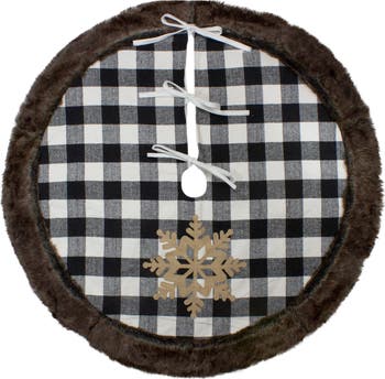 Add a cozy cottage touch to your holiday decor with this plaid tree skirt. The brown fur trim and burlap snowflake will make your tree standout. A perfect addition to your home this Christmas! Product Features: Off-white and black tree skirt Features a plaid design Accented with a burlap snowflake There is brown faux fur border trim Solid ivory on the back of the tree skirts Tie closure in the back for placement One-sided design Recommended for indoor use only Perfect to protect floors and carpets surrounding your tree Spot clean or dry clean only Dimensions: 48" diameter Materials: polyester/faux fur/burlap