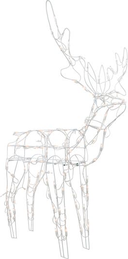 Make your outdoor space a winter wonderland with our lighted standing reindeer Christmas yard decoration! This stunning decoration features a durable, weather-resistant, powder-coated wire frame that will withstand harsh winter conditions. The pre-lit design includes 150 clear bulbs that will add a warm and welcoming glow to your yard, making it the perfect centerpiece for your holiday display. This majestic reindeer is sure to impress your guests and bring joy to your neighborhood. Don't wait to add this beautiful decoration to your collection and spread holiday cheer all season long! Product Features: Standing buck wire frame sculpture Color: clear bulbs / white wire Bulb size: mini Bulb type: incandescent Bulb count: 150 30" white lead cord Wire gauge: 22 Additional Product Features: Easy assembly, no tools required Ground stakes included Weather-resistant, powder-coating wire frame Contains 1 plug with end connector, allowing you to stack multiple lighted decorations together (not to exceed 210 watts) If one bulb burns out, the rest will stay lit Comes with replacement bulbs and spare fuses Collapsible construction for easy storage UL certified and approved for indoor/outdoor use 120 volts, 60 hertz Dimensions: 48"H x 36"W x 7"D Material(s): metal/glass bulbs/wire