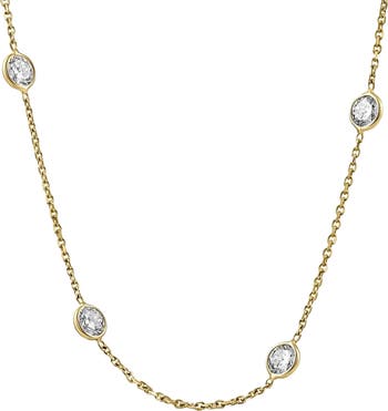 This high quality women's necklace features 10 round brilliant cut lab grown diamonds All diamonds are bezel set in solid 14k yellow gold. The necklace is 18" and features a lobster security.