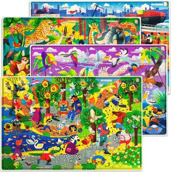- Set includes 4 puzzles featuring bugs, Arctic animals, dinosaurs, and city scenes