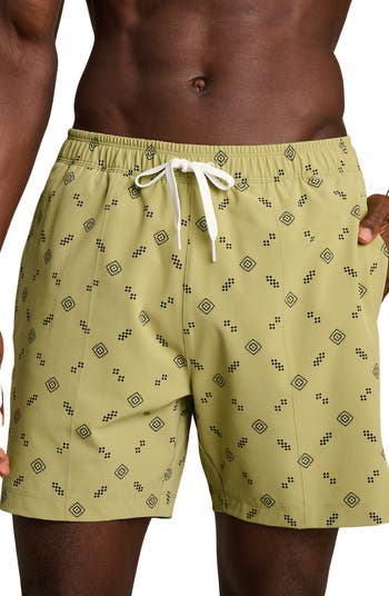 Stretchy, water-repellent fabric keeps you all-activity comfortable in swim trunks fitted with handy pockets and interior mesh shorts that keep odors at bay.