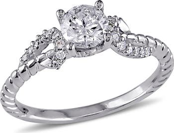 Crafted of 14k white gold, this ring features a round diamond set between side diamond swirls. The slim-style band features rib detailing and shimmers with a high-polish finish.