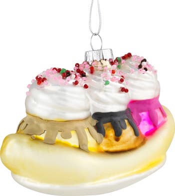 Add a touch of sweetness to your Christmas tree with this banana split glass ornament. This charming ornament features a luscious banana nestled in a silver bowl, topped with mouthwatering scoops of vanilla, chocolate, and strawberry ice cream. Adorned with generous drizzles of hot fudge, caramel, and strawberry sauce, it's a treat for the eyes. To complete the delectable masterpiece, whipped cream and sprinkles provide the perfect finishing touch. Hang this scrumptious ornament and let it bring a dash of whimsical indulgence to your holiday decorations. Product Features: Banana split Christmas ornament Matte and shiny finish Accented with shiny white, pink, brown and red beads Displays vanilla, chocolate and strawberry ice cream Hot fudge, caramel and strawberry sauce Fully dimensional ornament Equipped with a silver ornament cap and hanging cord For indoor use only Dimensions: 2.5"H x 5"W x 3"D Material(s): glass