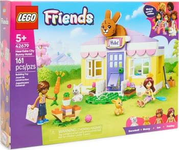 Hop into storytelling with this LEGO® Friends Heartlake City Bunny Hotel (42679) toy for girls and boys ages 5 years and up. This pretend play toy includes 2 minidolls and 2 toy bunnies, letting kids tell animal care stories. This cute set is packed with fun details, like the special pet door for the bunnies and the cute bunny sign. Inside there’s a carrot-shaped rug, a sleeping area with bunny beds, plus a checklist to check the bunnies in and out of the hotel. Outside is a seating area forthe bunnies, where they can sit together and enjoy a carrot cupcake. Other accessories inspire kids to care for the pets with a brush, yarn ball, food and water for the bunnies and a shovel to scoop up the rabbit poop. This set makes a great gift for girls and boys who love animals.