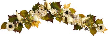 Capture the beauty of fall with this Autumn Sunflower and Pumpkin Artificial Garland. Variegated sunflowers and hydrangeas adorn a green silhouette of leaves, accented by a palette of fall-foliage inspired leaves. To soften the look and bring a rustic, intimate touch, pumpkins bring an exciting draw to the eye and color. With dimensions of 5ft., curate this garland in a mantel, bedframe or staircase. Perfect for the Harvest season and Thanksgiving . Artificial garlands are manufactured using synthetic materials, such as polyester material or plastic, and are well designed and constructed to be life-like in appearance. This item will need to be re-shaped when removed from the secure box to allow it to reach its fullest size. Your plant will look beautiful for years to come; simply wipe clean with a soft dry cloth when needed.