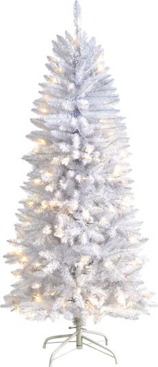 Are you dreaming of a white Christmas? Fulfill all your dreams with this white artificial Christmas tree. Inspired by nature, this tree has a slim silhouette that mimics its real counterparts' natural foliage and texture. With 491 bendable branches, you can easily display all your favorite ornaments. Save time and money with the pre-strung 150 lights. Standing 5ft. from a metal stand, curate in any compact area. Perfect for an apartment, kids' room, or home office. Faux Christmas Trees are manufactured using synthetic materials, such as polyester material or plastic, and are well designed and constructed to be life-like in appearance. This item will need to be re-shaped when removed from the secure box to allow it to reach its fullest size. Your artificial Christmas Tree will look beautiful for years to come; simply wipe clean with a soft dry cloth when needed.