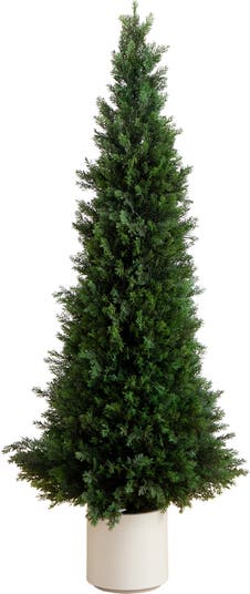 bring the best of the Pacific Northwest's dreamy forests with the artificial cedar tree. Inspired by the dreamy landscape, this cedar has lifelike leaves that look real. Crafted from high-quality materials, bend the branches to fit in your space for a custom look. Manufactured through a special, secret process, this piece is safe for outdoor use, display under a covered surface for longevity. Standing 5' from a white planter, you'll faux for this piece. Great for patios, porches, entryways and more. *Bring inside during inclement weather.