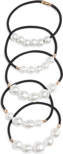 Put an elegant finish on your updos with this pack of ponytail holders strung with lustrous faux pearls in a variety of shapes and sizes.
