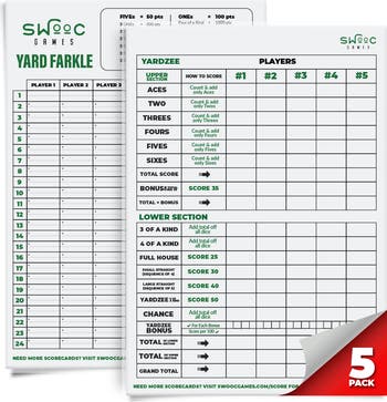 - 5 YARDZEE & FARKLE SCORECARDS – No need to share scorecards anymore. Each player gets their own sheet! Includes 5 double-sided scorecards with Yardzee on the front and Farkle on the back, plus rules.