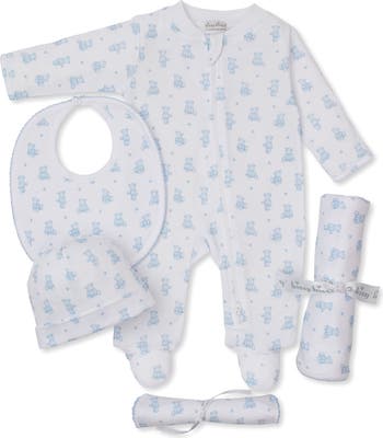 The perfect gift set for the little one in your life includes a footie, hat, bib, burp cloth and blanket—all patterned in darling bears.