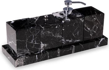 Elevate your bathroom decor with an elegant marble set that includes two tumblers, a canister with lid and a dispenser for soap or lotion on a sleek tray.