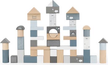 LABEL LABEL: WOODEN BLOCKS 50PCS - BLUE - The Label Label Wooden Blocks set is thoughtfully crafted from high-quality, FSC-certified beech wood, ensuring both durability and sustainability. This 50-piece set includes a combination of natural wooden blocks and colorful blocks, each painted with child-safe, water-based paints in soothing nougat, white, and grey shades. These pastel colors and smooth finishes make the blocks both visually appealing and safe for young children. Each block in the set features various shapes, sizes, symbols, and patterns, offering endless possibilities for building, stacking, and imaginative play. The blocks come neatly packaged in a convenient storage box with a handle, making them easy to store and carry for playtime at home or on the go. Additionally, the set includes a booklet with creative building ideas to inspire your child's imagination and encourage creative problem-solving. As children build and stack with the blocks, they develop fine motor skills, spatial awareness, and hand-eye coordination. The open-ended nature of the set also stimulates creativity and helps strengthen cognitive abilities as kids explore different ways to arrange and combine the blocks. Ideal for toddlers and children ages 2 and up, the Label Label Wooden Blocks set is the perfect addition to any playroom, promoting hours of educational fun and imaginative development. INCLUDES: 50 wooden blocks that store away in the included box.