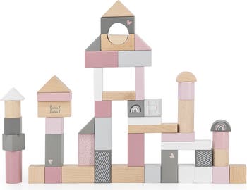 LABEL LABEL: WOODEN BLOCKS 50PCS - PINK - The Label Label Wooden Blocks set is thoughtfully crafted from high-quality, FSC-certified beech wood, ensuring both durability and sustainability. This 50-piece set includes a combination of natural wooden blocks and colorful blocks, each painted with child-safe, water-based paints in soothing nougat, white, and grey shades. These pastel colors and smooth finishes make the blocks both visually appealing and safe for young children. Each block in the set features various shapes, sizes, symbols, and patterns, offering endless possibilities for building, stacking, and imaginative play. The blocks come neatly packaged in a convenient storage box with a handle, making them easy to store and carry for playtime at home or on the go. Additionally, the set includes a booklet with creative building ideas to inspire your child's imagination and encourage creative problem-solving. As children build and stack with the blocks, they develop fine motor skills, spatial awareness, and hand-eye coordination. The open-ended nature of the set also stimulates creativity and helps strengthen cognitive abilities as kids explore different ways to arrange and combine the blocks. Ideal for toddlers and children ages 2 and up, the Label Label Wooden Blocks set is the perfect addition to any playroom, promoting hours of educational fun and imaginative development. INCLUDES: 50 wooden blocks that store away in the included box.