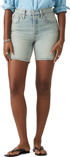 Tinted and lightly distressed, these low-stretch denim shorts feature a high waist, a fitted silhouette and a mid-thigh length that's comfy and classic.