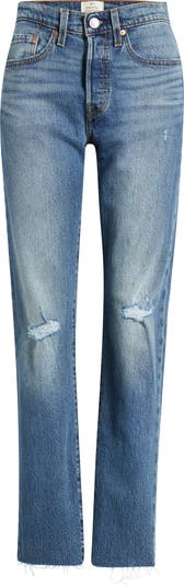 Faded and whiskered to old-favorite perfection, these laid-back jeans in a relaxed straight-leg silhouette feature softly distressed details for a lived-in feel.